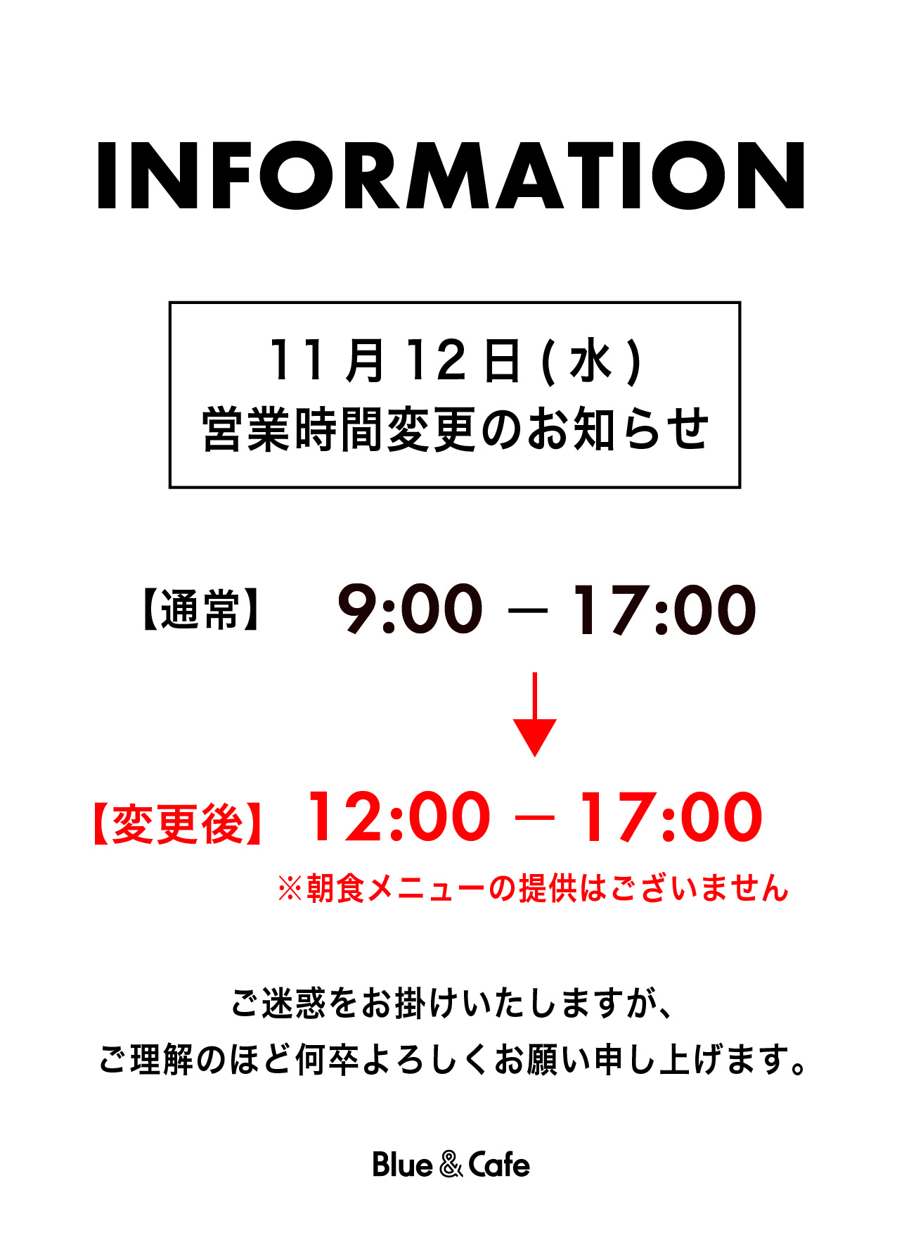 11月12日(水)営業時間変更のお知らせ